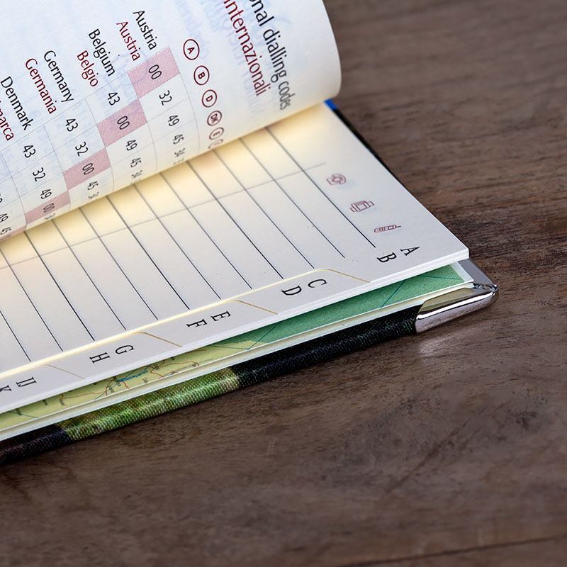 El directorio telefónico personalizable ofrece una gran calidad de acabados. Elaborado completamente a mano, dispone de tapa dura de madera tanto en el frente como en el reverso, ambos cubiertos con satén de alta calidad y enmarcados con topes de metal en las esquinas. El interior se compone de 80 páginas de papel a rayas ordenadas alfabéticamente. La impresión se lleva a cabo a través de la técnica de sublimación, proceso mediante el cual la tinta se inyecta directamente sobre la tela creando unos resultados excelentes.