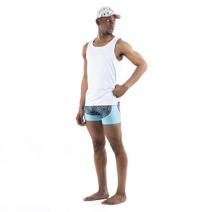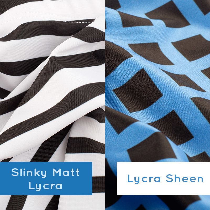 Nuestra técnica de impresión con tintas a base de agua fija los colores de manera permanente sin generar residuos tóxicos, perfecta para un uso prolongado en contacto con la piel. La versión en lycra mate ofrece un ajuste más firme, mientras que la lycra brillante proporciona mayor elasticidad. Ambos tejidos incorporan un cordón interior discreto para una sujeción a medida.