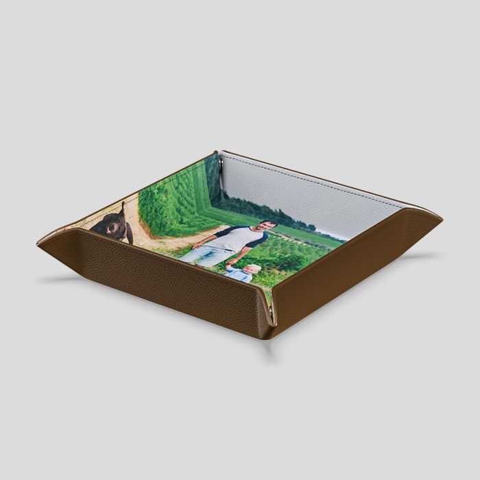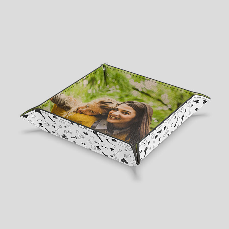 Una bandeja organizadora de cuero es un regalo perfecto para tu pareja. Además de estar 100% personalizada, esta bandeja es un accesorio útil para mantener cualquier objeto a mano en los espacios comunes. Perfecta para bisutería, notas, monedas, llaves, material de oficina y demás objetos pequeños que quieras mantener organizados. Siempre tendrás algo que dejar dentro, y siempre te sacará una sonrisa cuando la utilices al estar impresa con tus recuerdos.