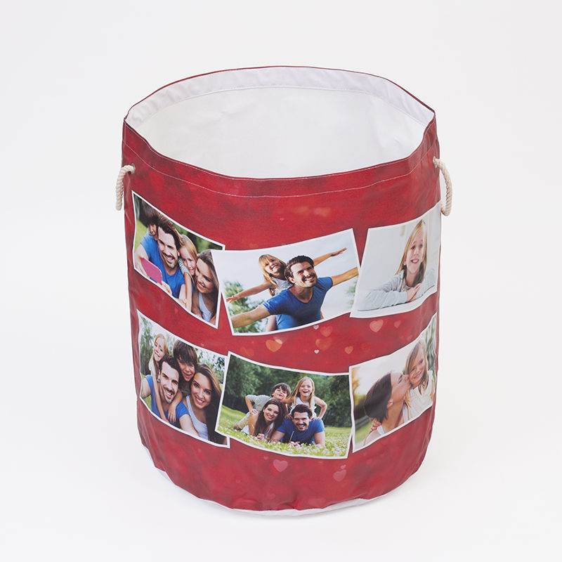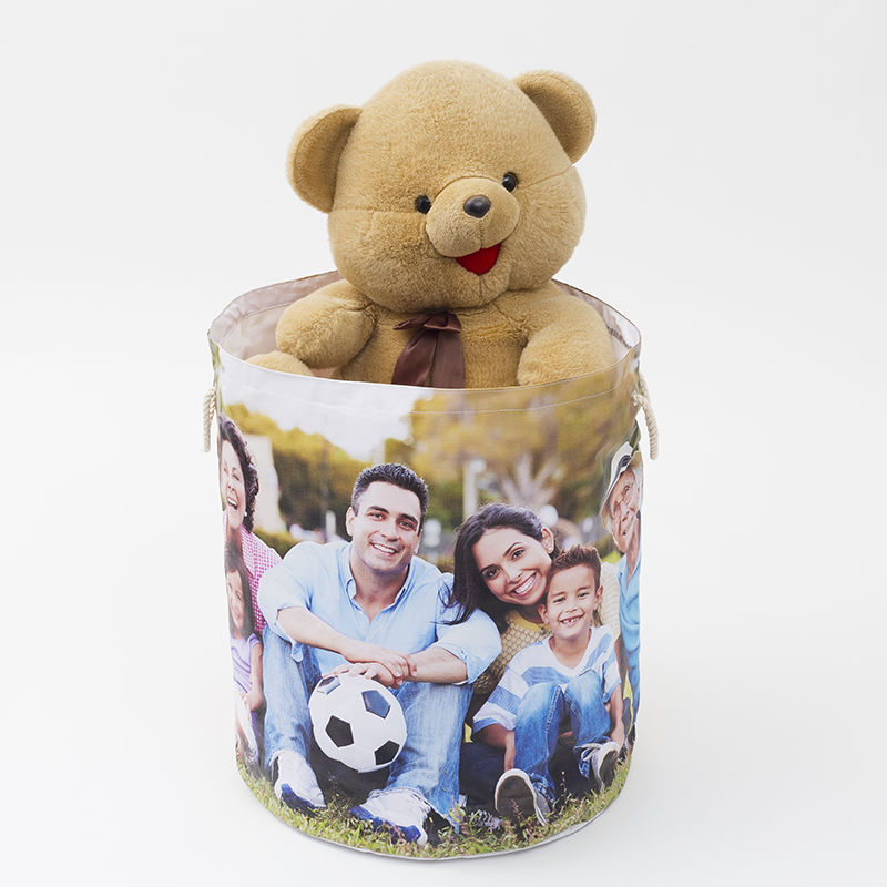 Nuestra bolsa de almacenaje personalizada está confeccionada a mano pieza a pieza, imprimiendo tu arte en dos paneles de tela que luego se unen y se forran con un interior resistente al agua. Gracias a su tamaño, es perfecta como cesta para juguetes personalizada en la habitación infantil, bolsa para ropa sucia personalizada en el baño o como cesta organizadora personalizada en cualquier rincón de la casa. También funciona como bolsa de ropa sucia personalizada para viajes o residencias universitarias.