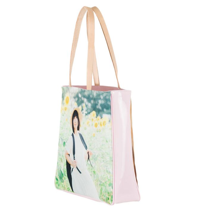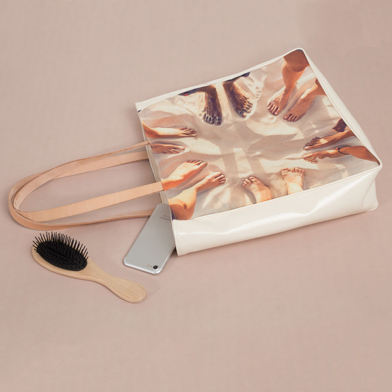 Fabricada con resistente vinilo, esta espaciosa bolsa personalizada para la compra cuenta con asas de cuero laminado y un práctico bolsillo interior para tenerlo todo bien organizado. Primero se imprime a mano y luego se cose y se acaba artesanalmente. Además, antes de ser enviado se la somete unos estrictos controles de calidad.