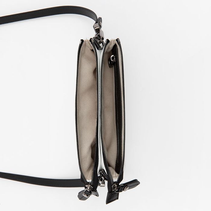Al final se añaden los ribetes negros y las cremalleras para crear un estilo elegante y esconder las costuras. Seguidamente se añade la tira de cuero con hebilla o la cadena metálica del color que hayas elegido, en ambos casos la tira de cuero y los bordes exteriores se pintan a mano para asegurar que son 100% impermeables, lo cual mejora la durabilidad del bolso.