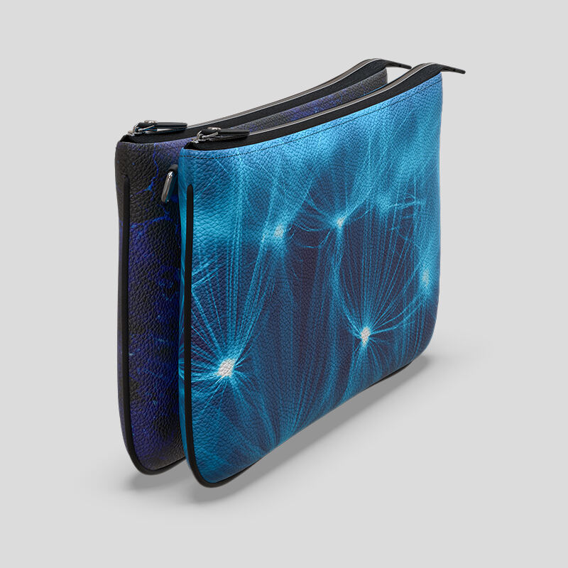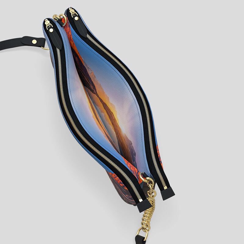 Primero, tu diseño se imprime digitalmente en el cuero de Nappa liso o texturizado, según hayas elegido. Utilizamos un proceso de impresión especial que permite que nuestras tintas eco se fusionen en profundidad con las fibras del material para generar una impresión vibrante, resistente y en alta definición. Una vez esté el cuero impreso, se corta siguiendo el patrón de tu bolso de mano doble y se forra con ante sintético suave.