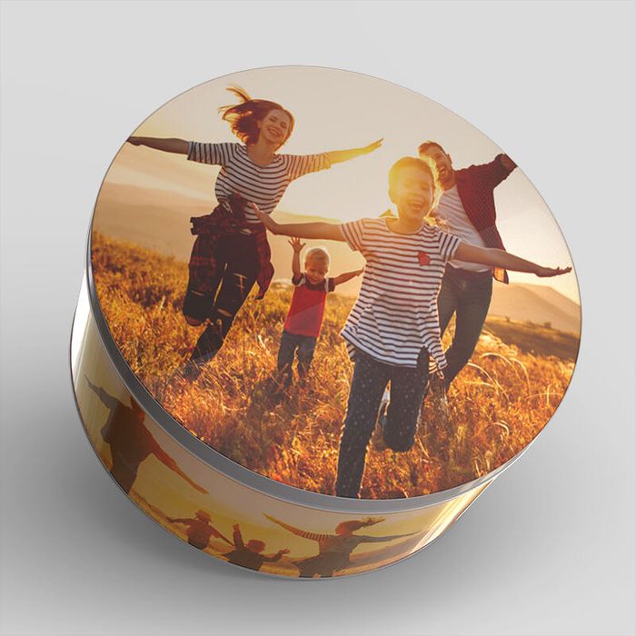 Esta caja redonda de metal se puede personalizar con tus fotografías favoritas o un collage de fotos sobre... Leer más