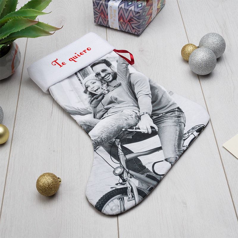 Colgar los calcetines en la repisa, la puerta o la chimenea es una de las tradiciones más entrañables de las fiestas. Con nuestro calcetín navideño personalizado podrás marcar la diferencia gracias a la impresión integral en terciopelo, que reproduce tus fotos y diseños con colores intensos y muy definidos. Si buscas calcetines navidad chimenea personalizados, este modelo te encantará.