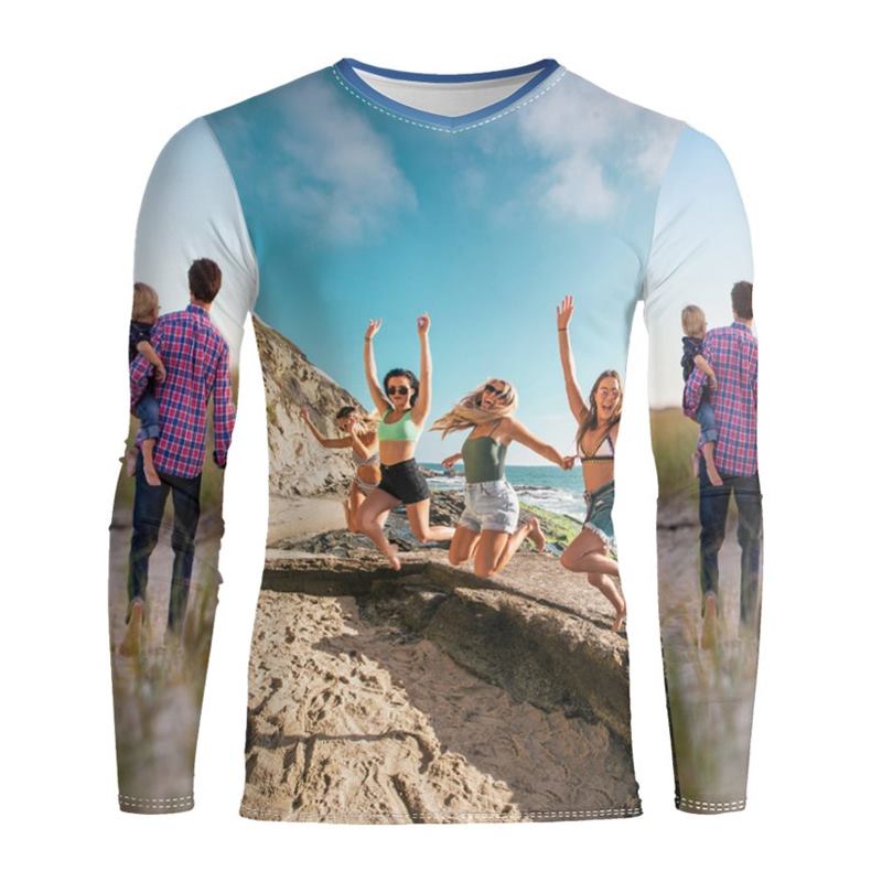 La impresión en cualquier tela jersey es puro deleite. La base blanca es perfecta para imprimir detalles, colores brillantes y tonos fuertes. Puedes diseñar la parte delantera y la parte trasera por separado, al igual que cada manga e incluso la nervadura del cuello. En otras palabras, puedes utilizar varias de tus fotos favoritas para personalizar tu camiseta ajustada para hombre.