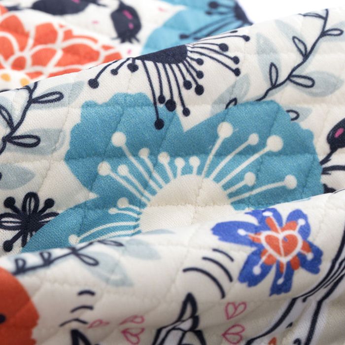 Capa de jersey. Tejido frontal y posterior con una capa de guata muy ligera entre ambos. Diamantes de acolchado estampados permanentemente. Buena elasticidad en el ancho. Ideal para prendas y bolsos si se combina con forro.