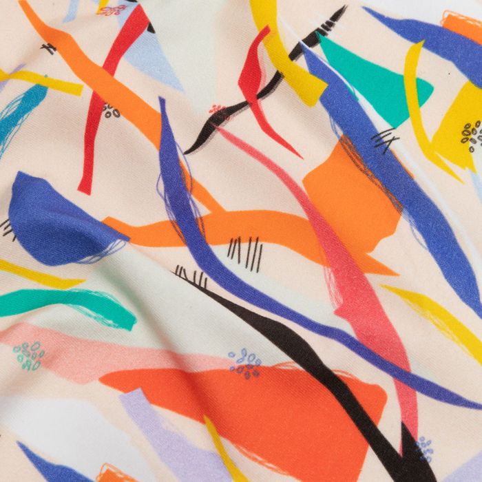 Jersey sencillo 95 % algodón / 5 % licra con estampado pigmentado suave. Buena resistencia del color y al lavado a bajas temperaturas. Debido a la naturaleza del jersey, es normal que encoja. Recomendamos pedir una talla mayor y cortarla a la medida correcta.