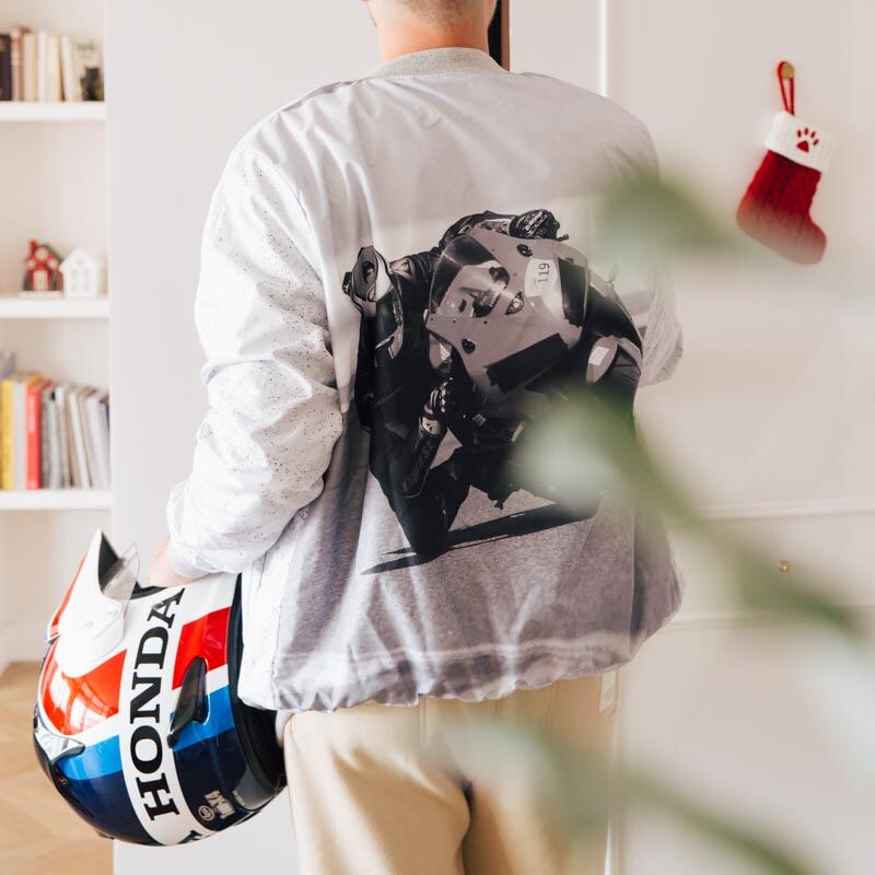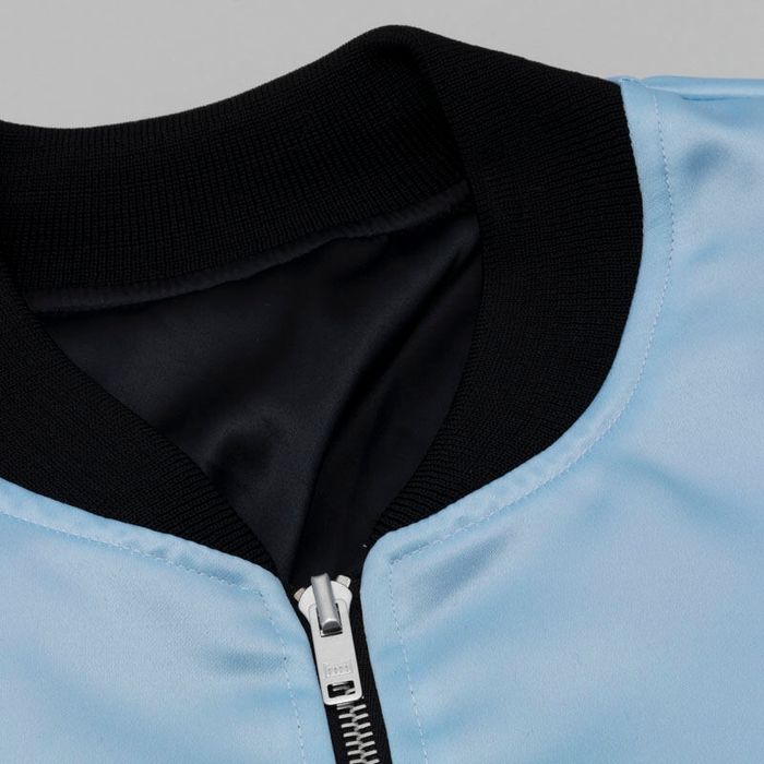 Exterior satén brillante / Forro satinado: Aporta luminosidad a tu chaqueta bomber con foto personalizada. La impresión luce nítida y el forro de satén añade ligereza y suavidad. Los acabados base pueden ser negros, grises o blancos.