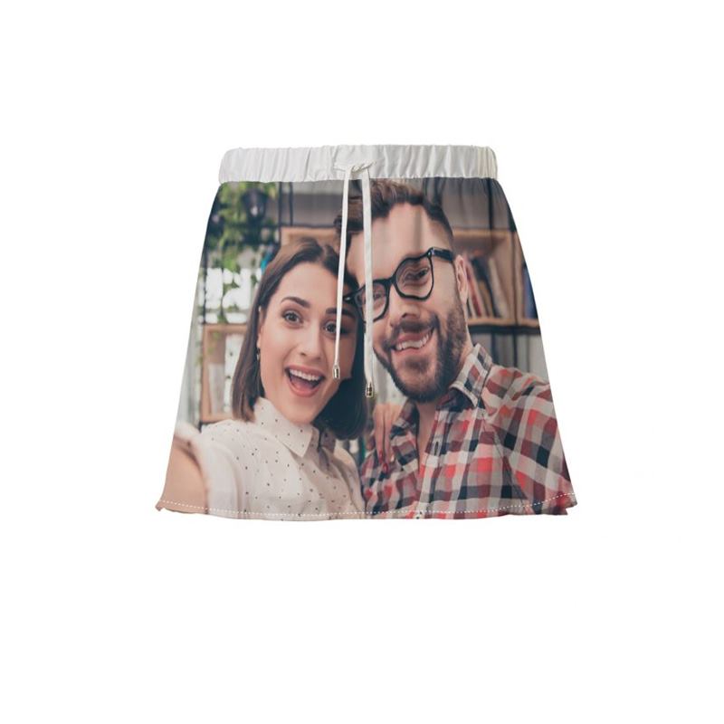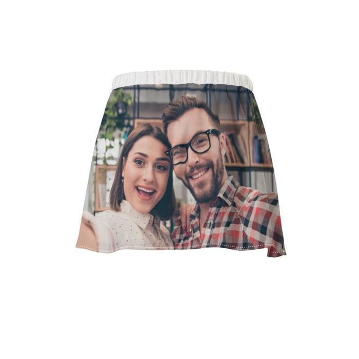 La mayor parte de tu falda se puede personalizar. Desde el diseño de la parte delantera y la parte trasera; el largo de la falda; y el color de la cintura, el cordón y el forro. Así puedes diseñar tu falda como tú quieras, utilizando tus mejores fotos o diseños. ¡Además puedes combinarla con otras prendas personalizadas!