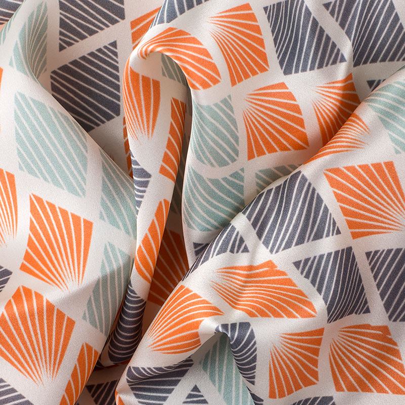 Satén de Seda Natural de 50 gr/m2. 12 mommes de peso. Superficie brillante, tacto sedoso, buena caída. Suave, colores fuertes, detalles nítidos. Usos: pañuelos ligeros, accesorios, decoración. <b> Encoge un 5% en la trama y un 8% en la urdimbre.</b> Colores vibrantes y negros profundos gracias a la química de tintas reactivas.
