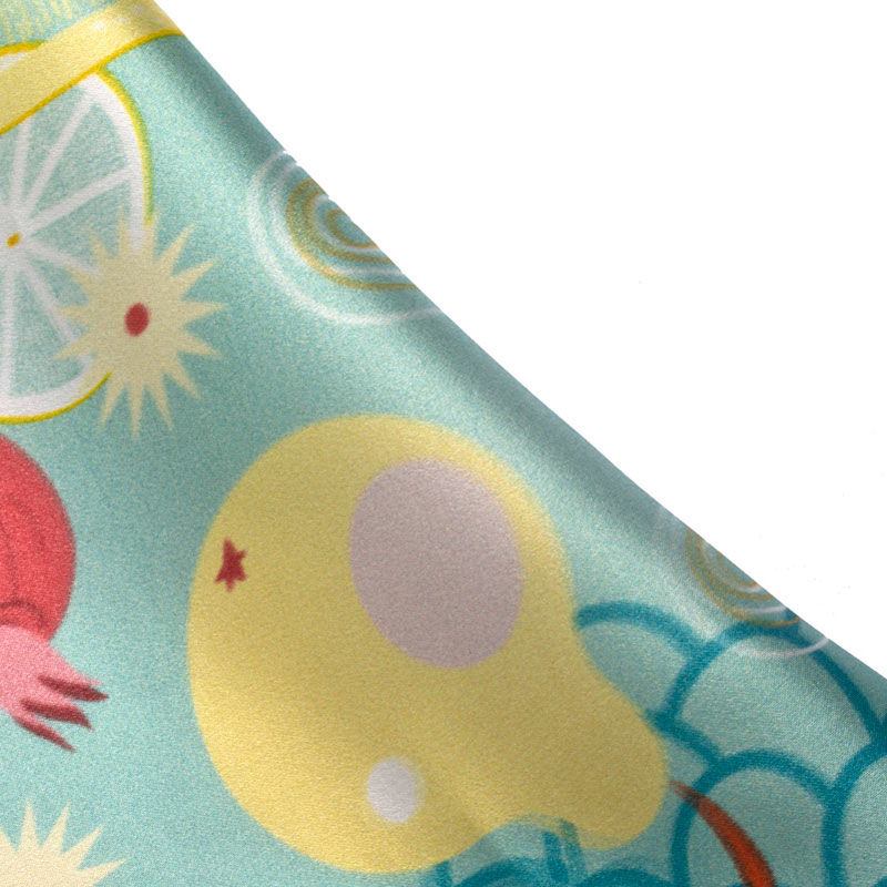 Imitación de seda con destacado brillo y colores vivos en su superficie impresa. Semi-transparente, suave y fresca en contacto con la piel. Ropa, forros y accesorios.