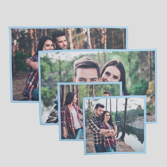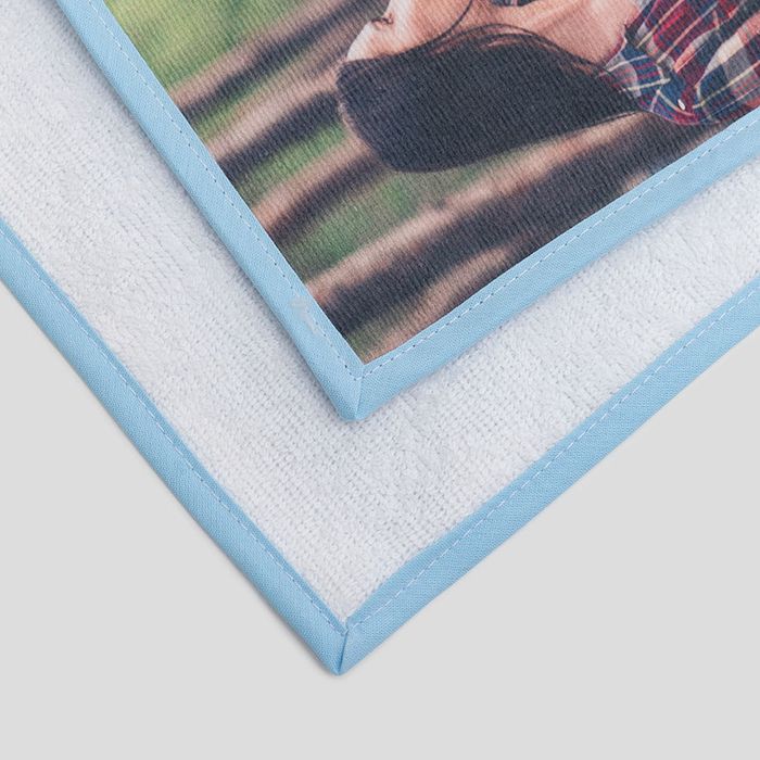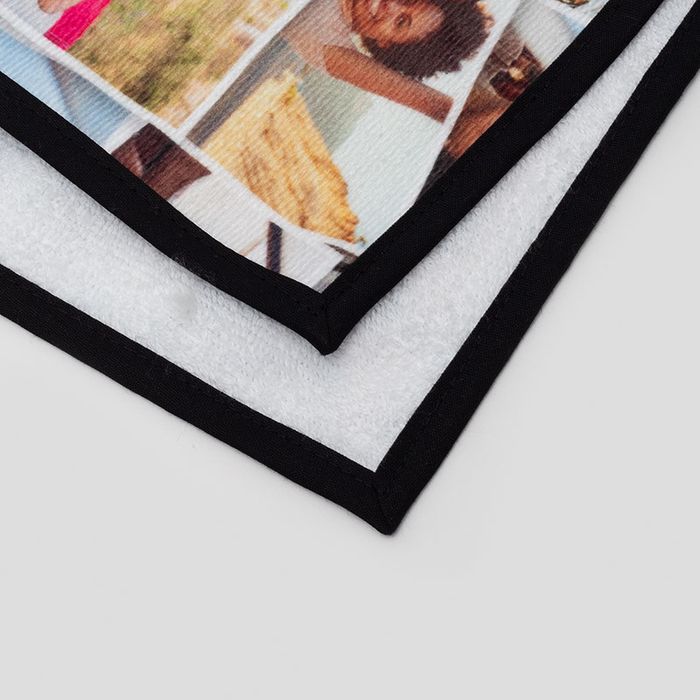 La posibilidad de personalizar cada una de las cuatro toallas te permite jugar con tu imaginación y elegir una sola foto o crear diferentes diseños para cada toalla ¡Incluso puedes conjuntar la gama cromática de tu baño con los ribetes de las toallas! Puedes elegir entre cuatro colores: rosa pastel, azul pastel, negro o blanco crudo.