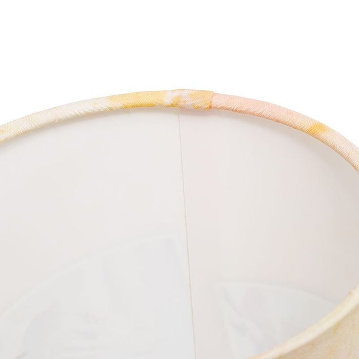 Utilizamos una tela de trama fina, recubierta con un forro ignífugo certificado, que deja pasar la luz de forma suave y homogénea. Una vez impresa, la pantalla se fija a un aro metálico robusto y se completa con un cable de 1,8 m listo para enchufar.