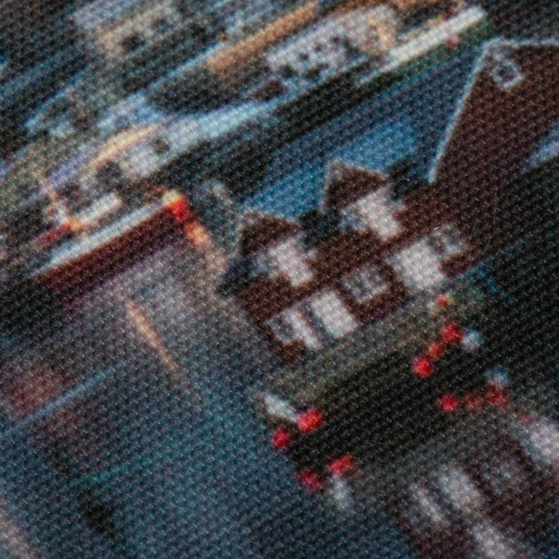 Por otro lado, la impresión se lleva a cabo con un procedimiento de última generación llamado “Dye Sublimination” que permite que el color sea absorbido profundamente en el material y no permanezca sólo en la superficie. De esta manera también es posible obtener el máximo rendimiento en los tonos más complicados y un brillo que perdura en el tiempo. Debido a la textura del la tela, el lienzo tendrá el clásico aspecto granulado (más detalles en las fotos).
