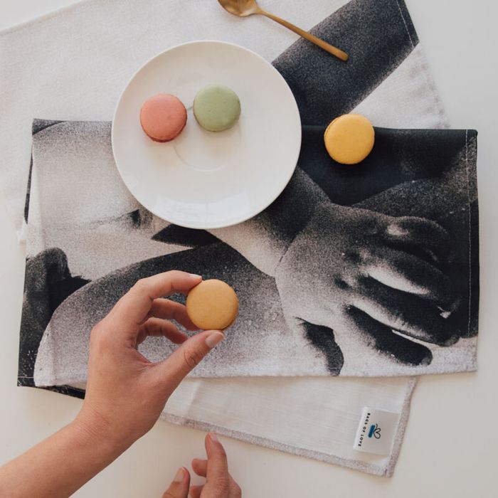 Elige entre cuatro tonos de ribete —crudo, azul marino, rojo o turquesa— o un borde ondulado para un acabado retro. Sin pedido mínimo: puedes comprar un paño de cocina personalizado para ti o realizar un gran pedido al por mayor.