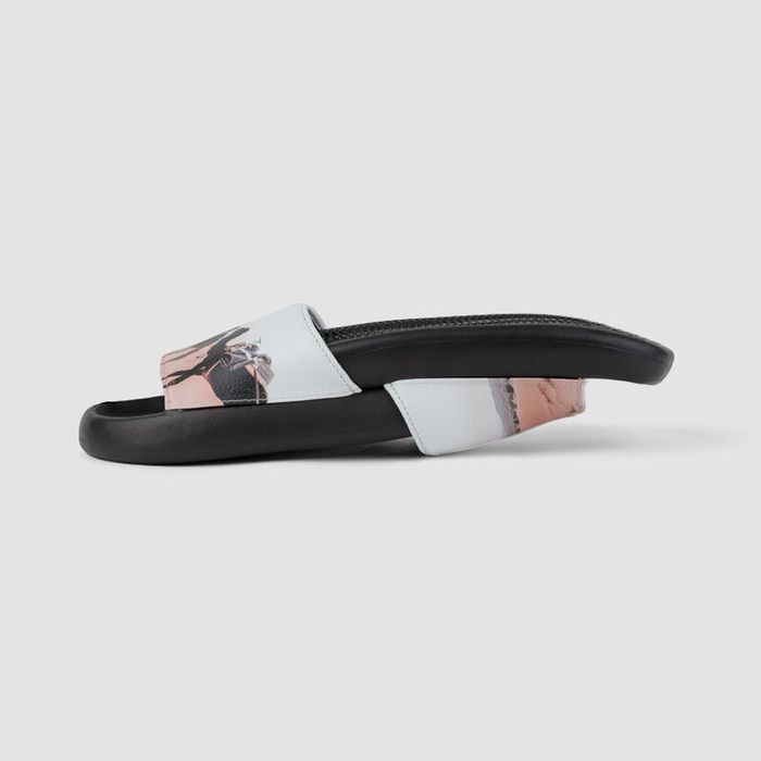 Cada par de deslizadores personalizados se confecciona a mano bajo pedido empleando piel de napa italiana y técnicas de impresión digital de última generación. El diseño se transfiere de forma permanente sobre la superficie texturizada, creando colores nítidos que no se despegan ni se desvanecen. Tras el cosido con el color de hilo que elijas, los sliders se revisan cuidadosamente antes de embalarlos y enviarlos. El resultado es un calzado duradero, cómodo y completamente único.