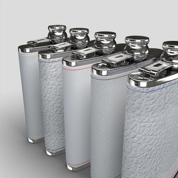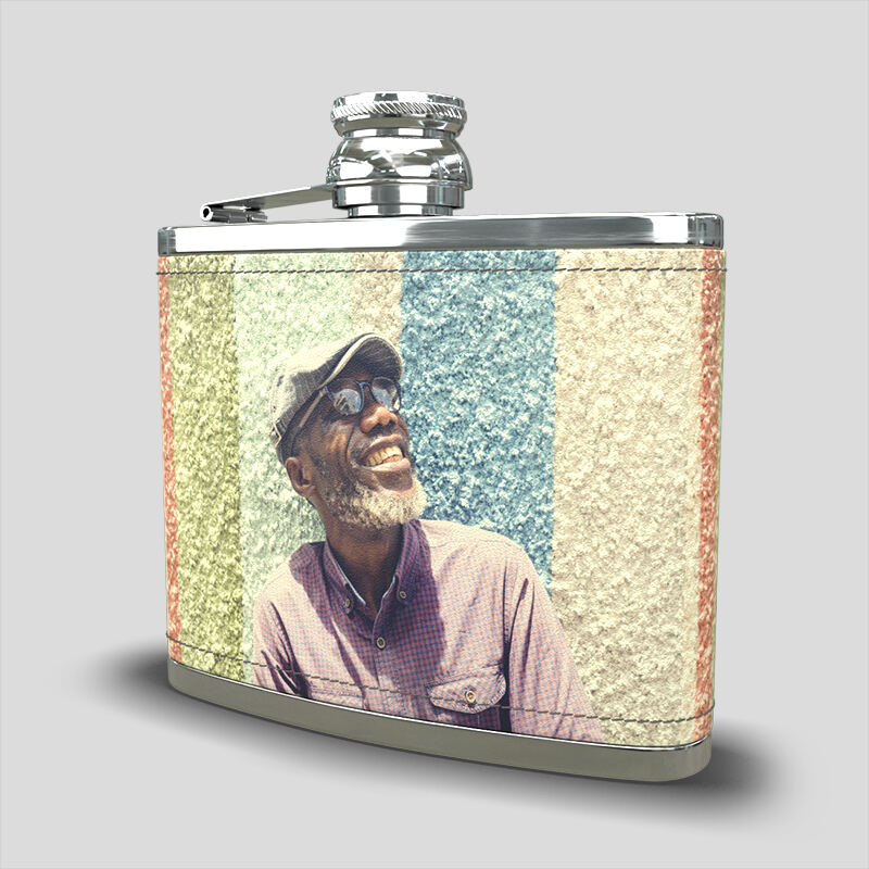 Sube ilustraciones, collages o un diseño minimalista. El cuero rodea completamente la petaca y se cose con hilo marrón, negro, crema, rojo o azul. Puedes elegir entre cuero de nappa liso, texturizado o versión vegana y ver la petaca personalizada en la vista previa 3D antes de pedirla.
