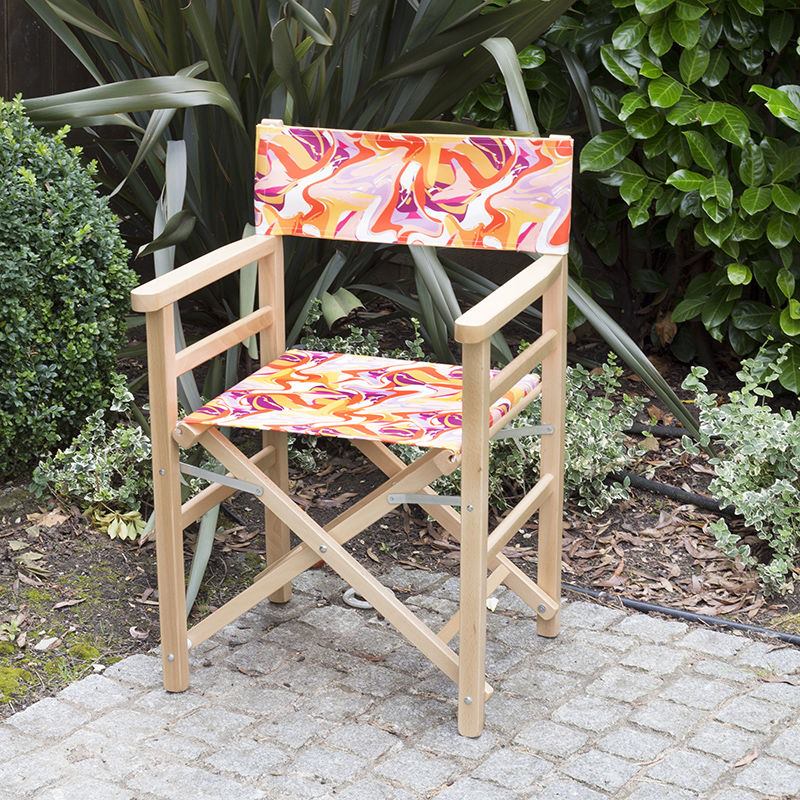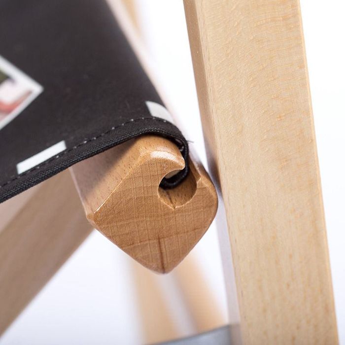 El respaldo y el asiento se fabrican con resistente tela de lona de 500 gr/m2, por eso se trata de una silla de director resistente y a la vez cómoda y segura. Por otro lado, la madera de haya de la estructura es también robusta y sólida. La tela se imprime primero y luego es cosida a mano, más tarde se adjunta a la estructura de madera con los clips metálicos que proporcionan fuerza y resistencia.