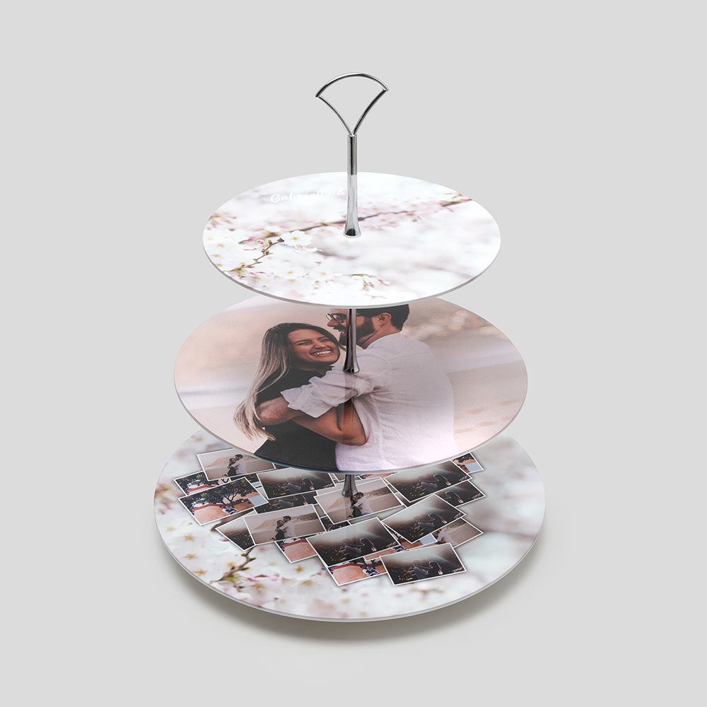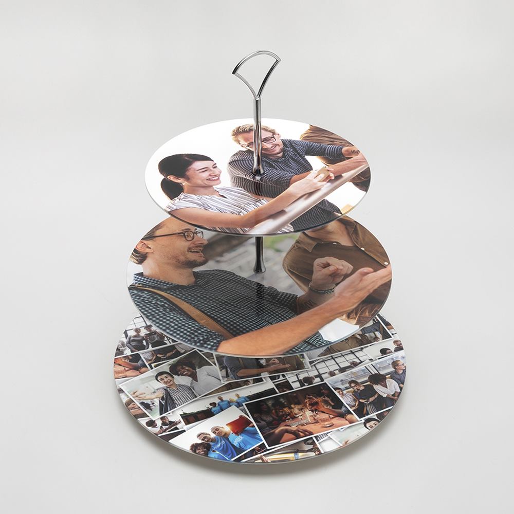 Cada soporte de tartas de 3 niveles personalizado se elabora con porcelana china rígida, conocida por su acabado liso y su resistencia al desgaste. Este soporte para tartas con diseño personalizado se imprime mediante sublimación de última generación que sella las tintas al agua directamente en la superficie, garantizando un resultado duradero y totalmente apto para uso alimentario.