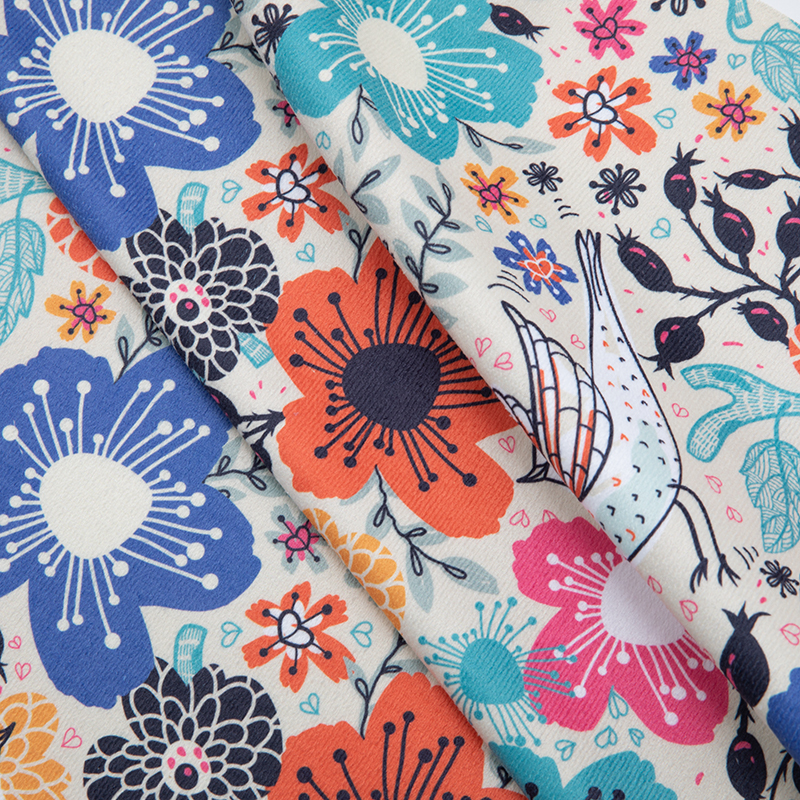 Como en cualquier proceso de impresión, existe la posibilidad de que la tela encoja ligeramente durante el proceso de producción. Dependiendo del tejido, se puede esperar que la tela encoja entre un 2-8%, algo a tener en cuenta a la hora de añadir las medidas que necesitas. Dicho porcentaje varía dependiendo de la tirada de impresión y del tipo de tela, por eso recomendamos pedir un poco más de cantidad de la que necesitas para tu proyecto.