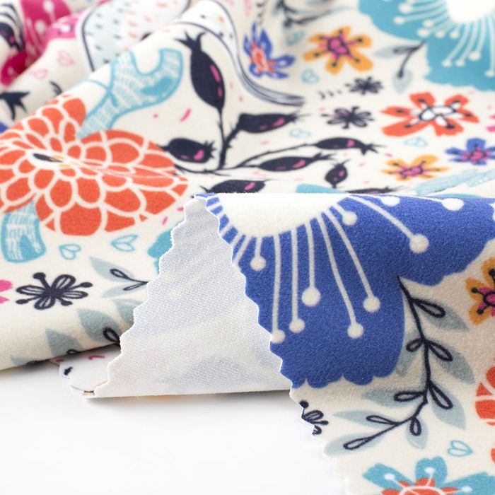 Muy suave con una caída elegante. Tacto liso y suave. Gran detalle en la impresión. Perfecto para vestidos, cojines y tapicería.
